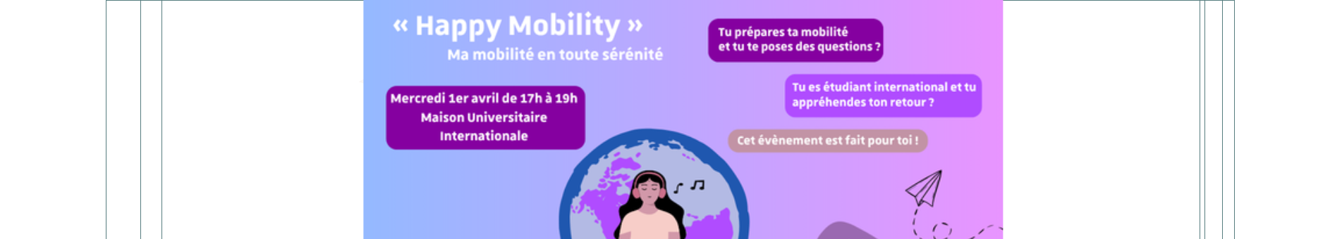 Alors que votre échange à Strasbourg touche bientôt à sa fin, nous avons le plaisir de vous inviter à Happy Mobility, un événement pensé pour vous accompagner dans cette période de transition.